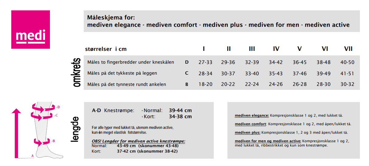Se målskjema for korrekte mål for hver størrelse. Det anbefales å ta mål på morgenen for riktigst mål.