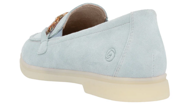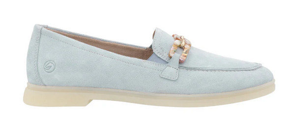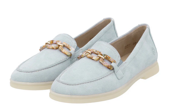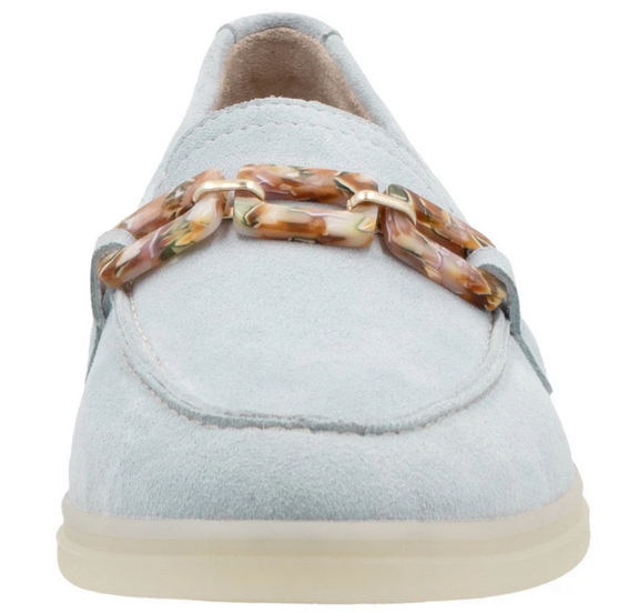 Lekker mokasin i lyseblått semsket skinn med flerfarget spenne oppå vristen.