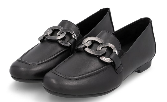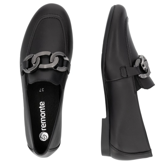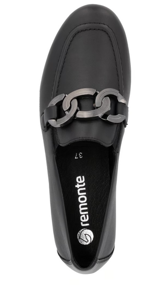 Lekker mokasin i mykt, sort skinn fra Remonte. Mokasinen har en behagelig og myk såle, og sitter godt på foten. Den har en pen pyntedetalj oppå vristen. Like tøff til bukser som til skjørt og kjoler.