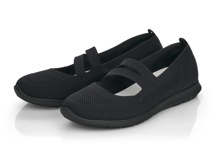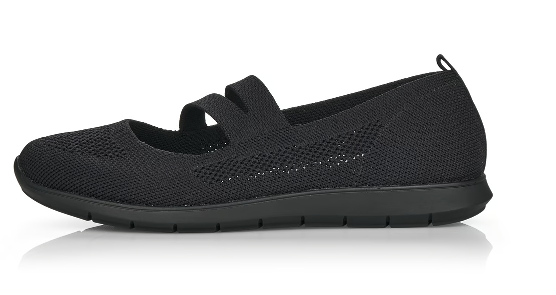 Lett og behagelig ballerina i lett, svart stoff fra Remonte. Denne har en god, oppbygd såle som man enkelt kan ta ut hvis man ønsker annen innleggssåle. Denne modellen er normal i størrelsen, så velg den størrelsen du ellers ville valgt.