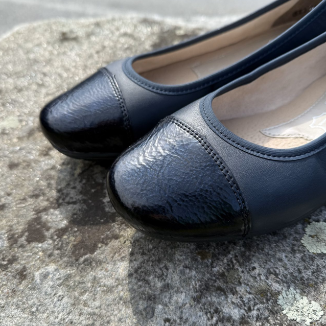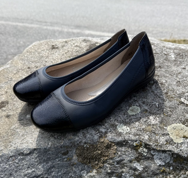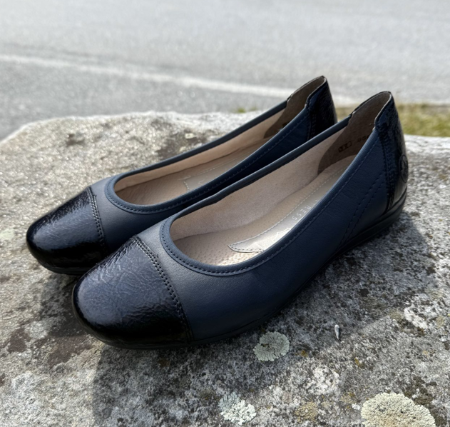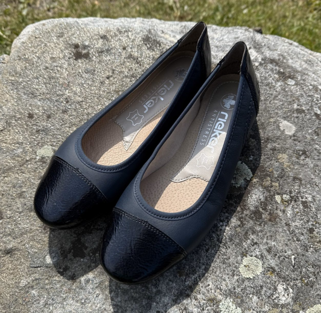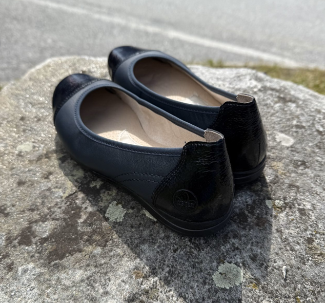 Nydelig og myk ballerinamodell i blått skinn fra Rieker. Mørkeblå detaljer på tupp og hælkappe. Flott til både selskap og hverdag.