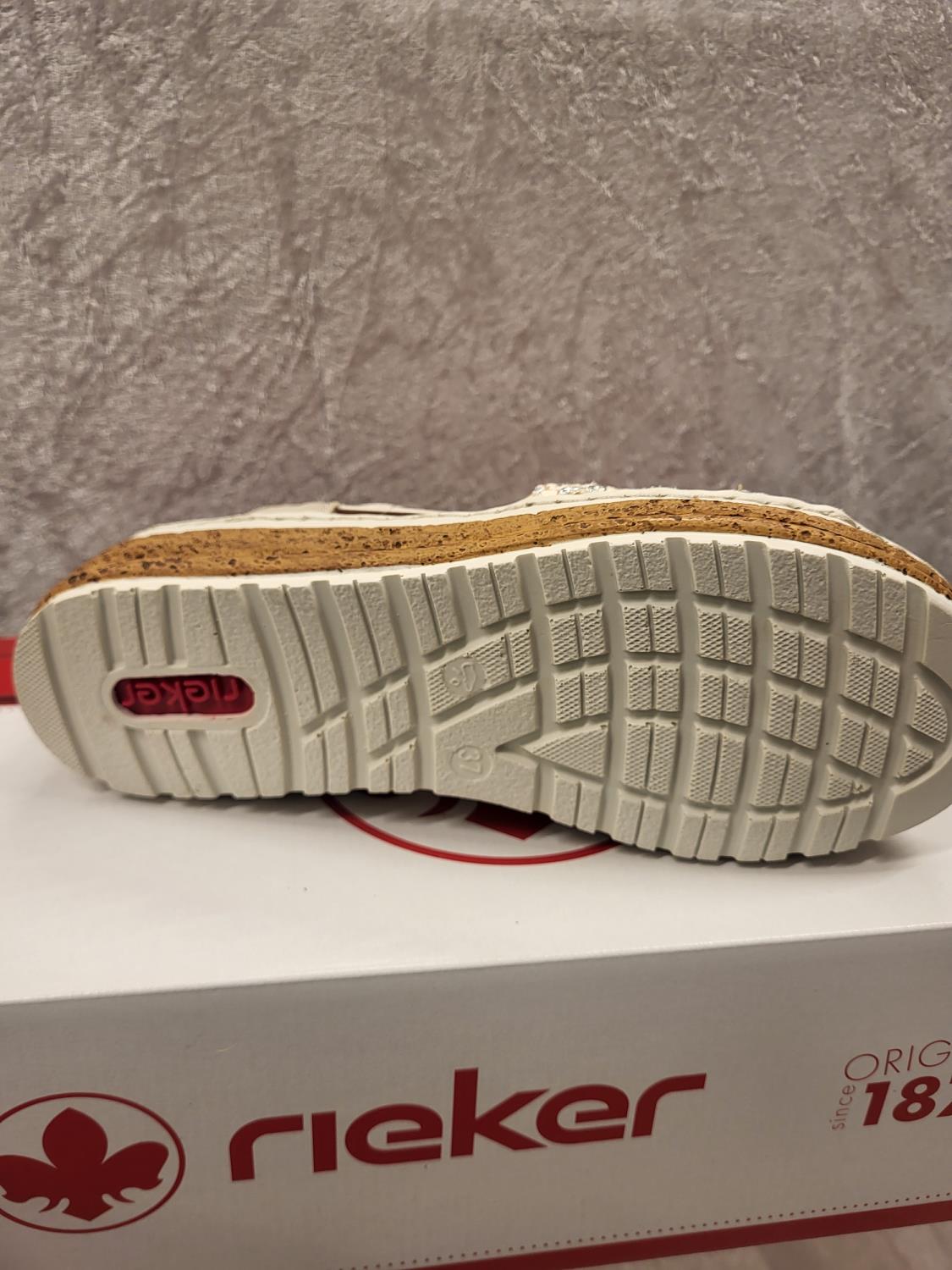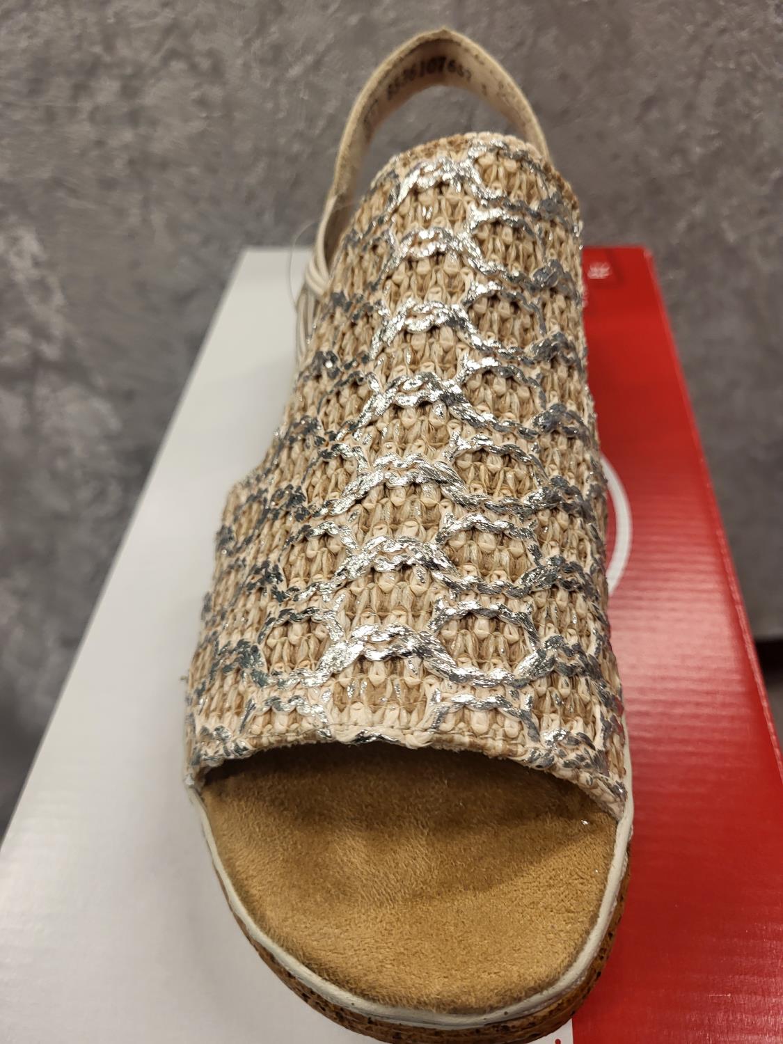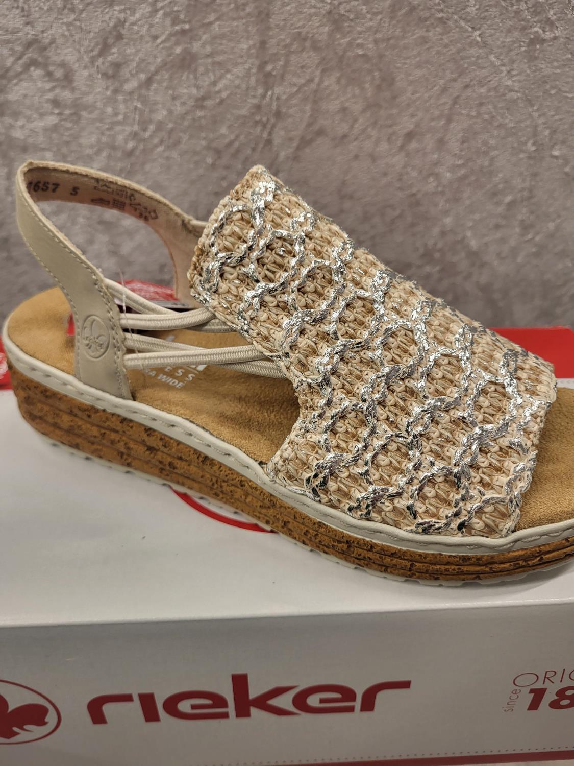Sandalen er beige, med sølv detaljer oppå. Strikk på hver side gir god passform.