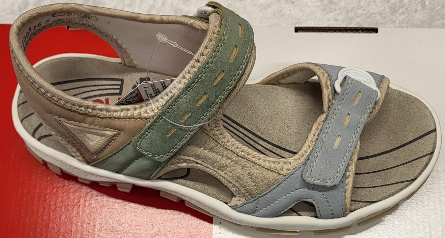 Sporty sandal til dame fra Rieker i duse fargetoner av beige, grønt og lyseblått.