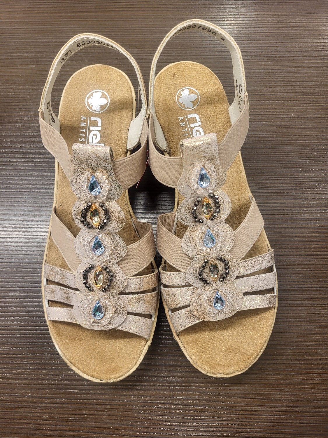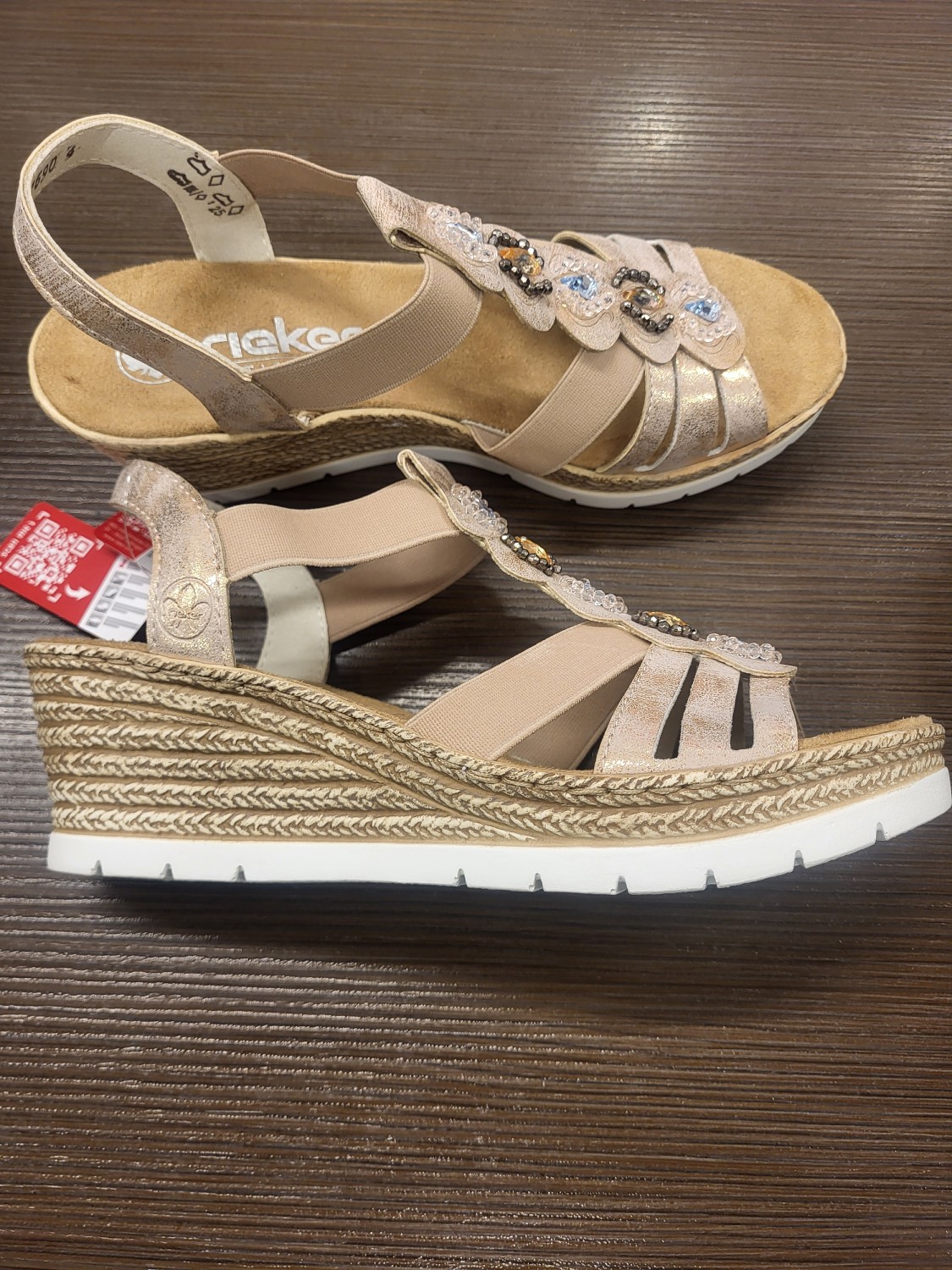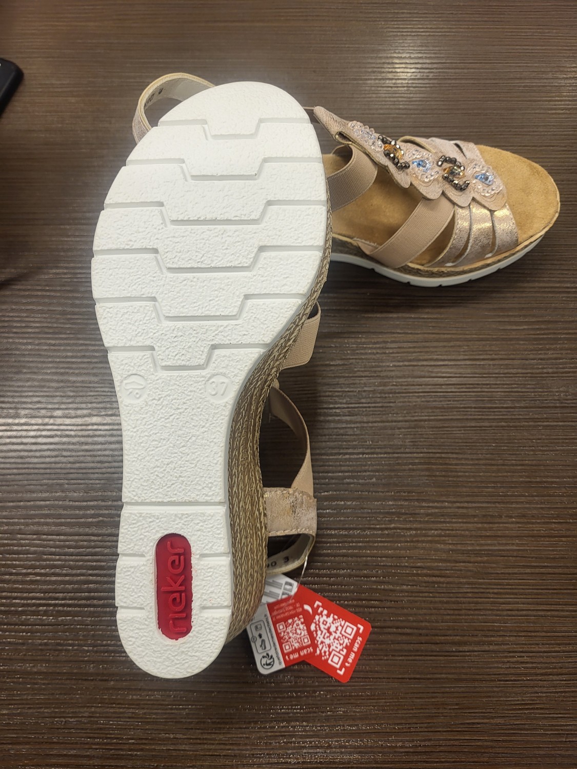 Modellen har kilehæl. Den har den behagelige Rieker Antistress sålen, som gjør den til en god sandal å gå med, også over litt tid.