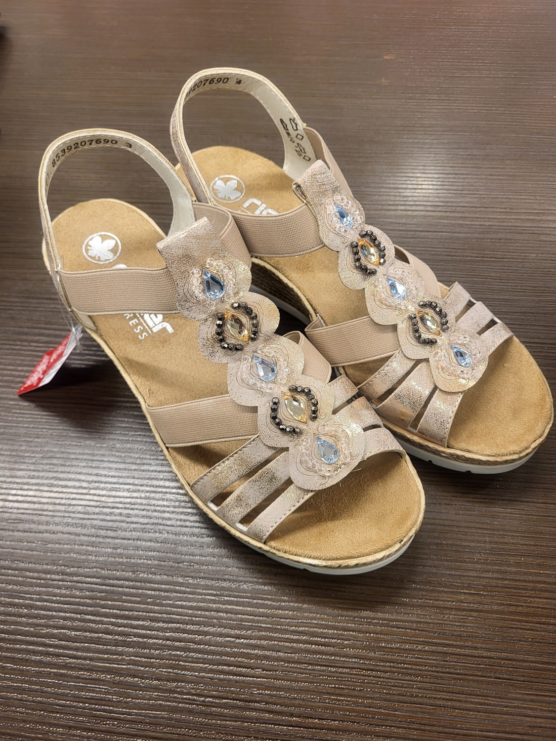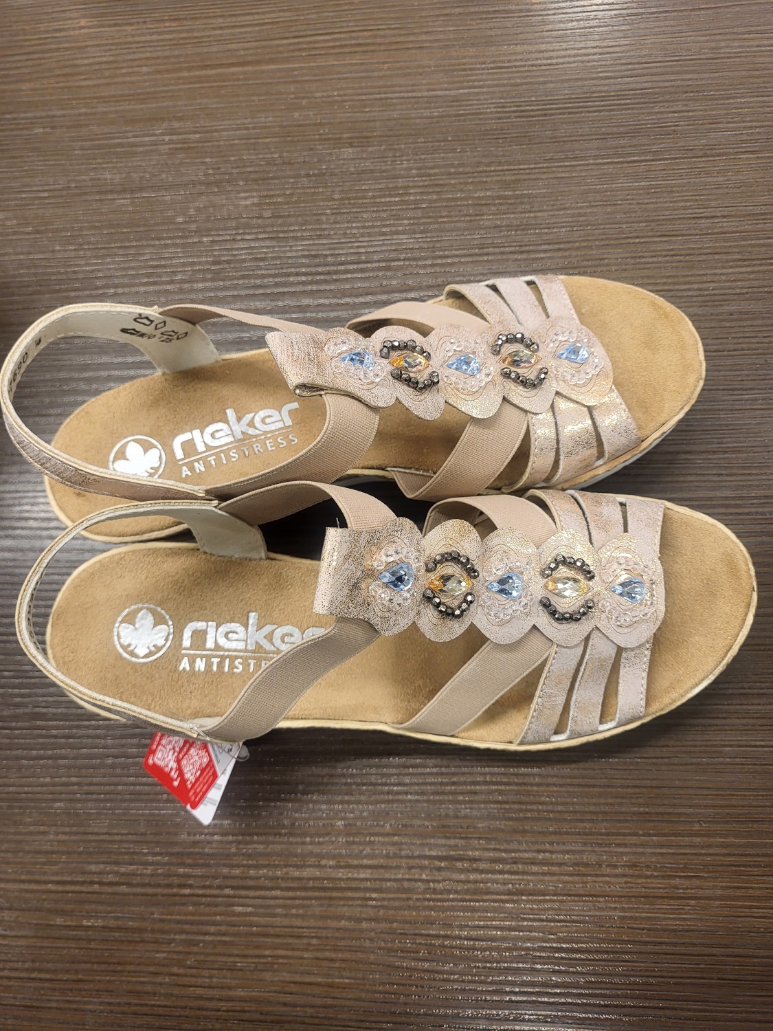Lekker sandal fra Rieker med rosa gullskimmer. Pene detaljer oppå vristen er den lille prikken over i'en!