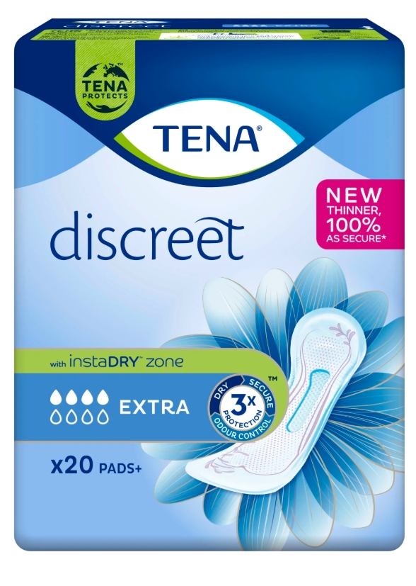 TENA Discreet Extra er tynt, diskret, hudvennlig inkontinensbind som gir effektiv beskyttelse mot urinlekkasjer.