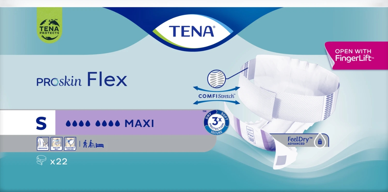 TENA Flex Maxi S er beltebleier som er utformet for tung til svært tung urinlekkasje.