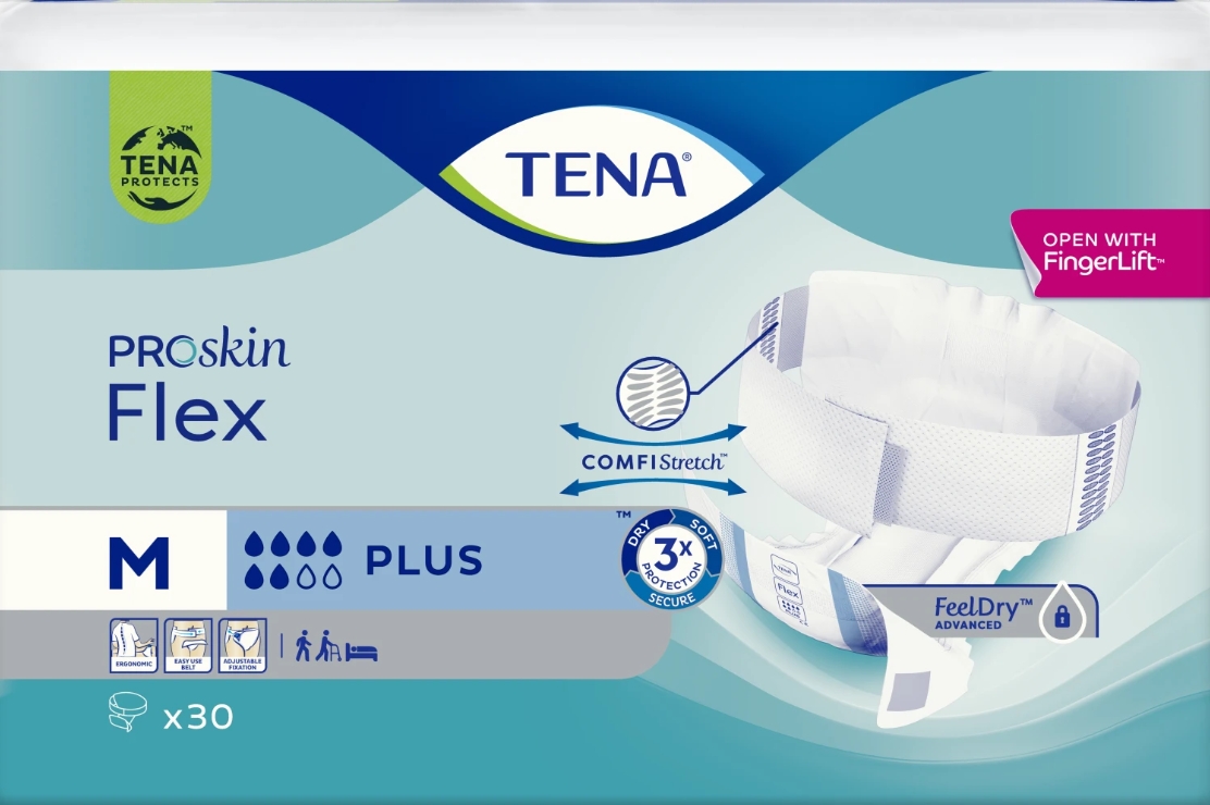 TENA Flex Plus M er beltebleier som er utformet for middels til tung urinlekkasje.