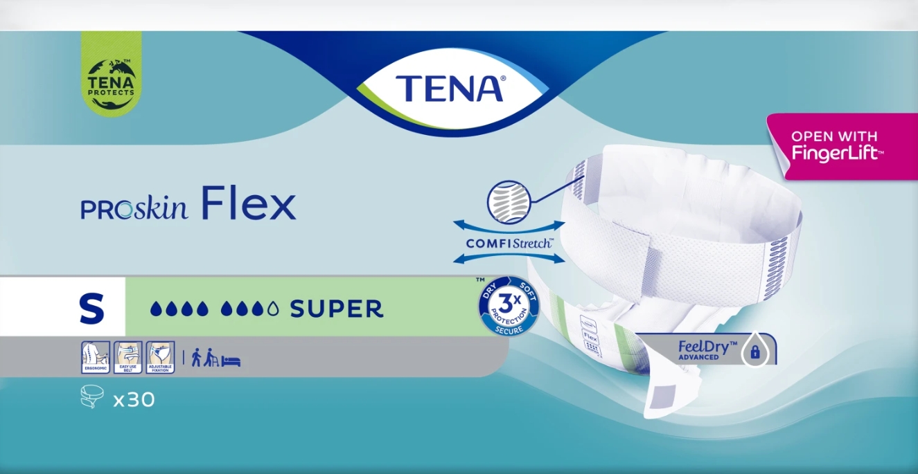 TENA Flex Super S er beltebleier som er utformet for tung urinlekkasje.