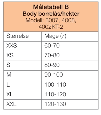 Kompresjonsbody spesielt til bruk etter mageplastikk og ved brystrekonstruksjon der man bruker eget vev fra mage. Ekstra kompresjonspute på nedre delen av magen. Puten er engangs og fjernes etter legens anbefaling. Egner seg IKKE til bruk dersom man KUN skal foreta fettsuging. Justerbare stropper som kan tas av. Lukkes med borrelås på sidene og i skrittet. Inneholder ikke latex.